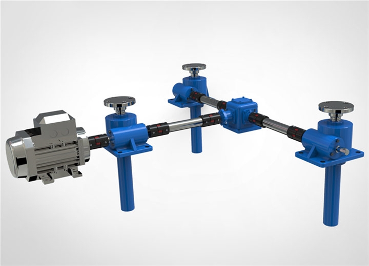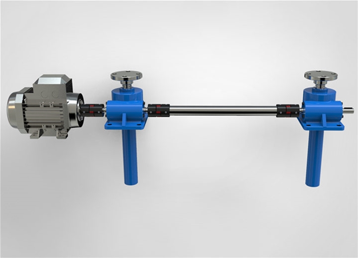 根據汽車生產線橫向調節功能的使用要求,采用兩臺滾珠絲桿升降機水平安裝,兩臺中間通過同步傳動軸連接,由一臺驅動源帶動兩臺進行同步橫向推拉動作,實現調節功能,為汽車生產線調節裝置提供穩定有效的解決方案。